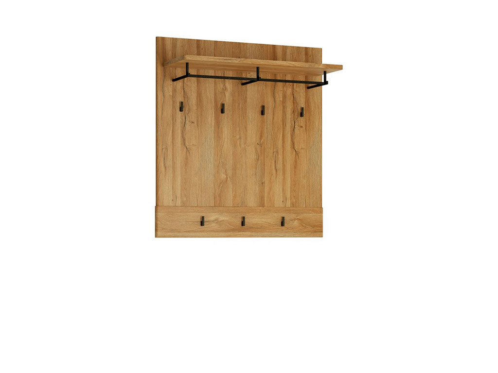 Панель в передпокій Cortina CNAG04 від модульної системи Cortina (Кортіна) Польської фабрики Wójcik (Войчік). Вішалка оснащена сімома функціональними гачками, перекладиною для вішалок і верхньою полицею. Випускається в кольорах: “дуб Грандсон“. Колекція меблів Cortina проводитися з ламинованої ДСП і МДФ. Петлі і направляючі з системою “тихого закриття“, ручки – металеві. Меблі стійка до пошкоджень і подряпин, впливу вологи і високої температури.