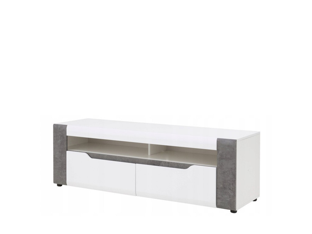 Тумба під телевізор 2S Brando B01 від Польської фабрики LIVEO (Ливео) — містить дві ніші та дві шухляди. Корпус виготовляється з ламінованої ДСП 16 мм з елементами МДФ. Фасади з МДФ завтовшки 18 мм, покриті плівкою ПВХ. Випускається в кольорі: "білий / білий глянець / бетон”. Застосовуються кулькові напрямні GTV повного висування. Ніжки з пластику в чорному кольорі. Фрезеровані ручки.