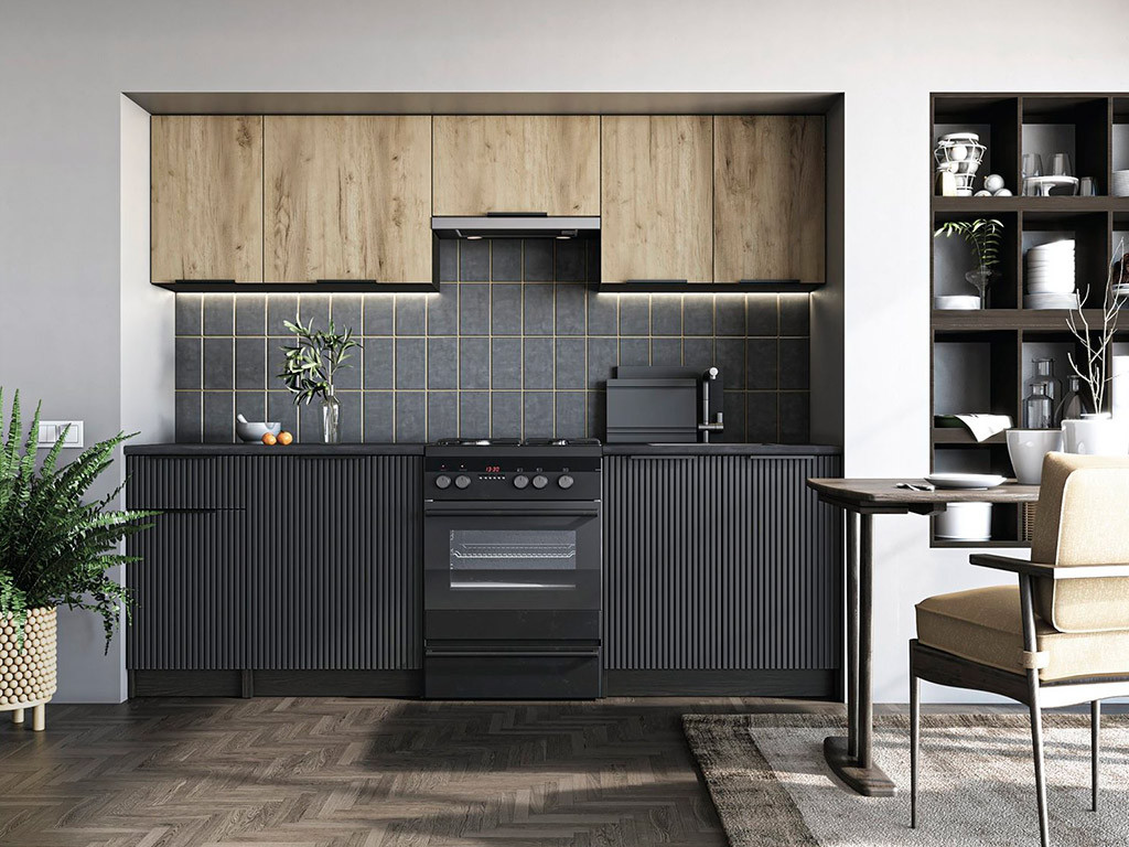 Кухонний гарнітур Alina 240 від польської фабрики Halmar (Халмар) — чудовий спосіб надати кухні стильного та функціонального вигляду. Рифлені чорні фасади нижніх шаф додадуть інтер'єру елегантності та сучасної виразності, а також створять цікаву структуру. Верхні шафи зі штучного дуба принесуть у простір тепло та природну затишну атмосферу.