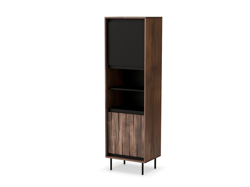 Вітрина Swing W-1 від польської фабрики Halmar (Халмар) — складається з дводверної частини та двох відкритих ніш. Корпус меблі виготовляється з ламінованого ДСП. Фасади із МДФ. Випускається в кольорі: "горіх/чорний". Ніжки з металу чорного кольору.