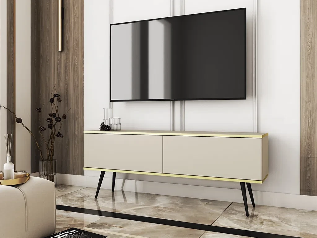 Тумба під телевізор Oro 135 від польської фабрики Piaski (Пяски) — складається з дводверної частини, які відвертаються зверху вниз. Меблі виготовляються з ламінованої ДСП із крайкою АБС. Випускається в кольорі: "пісочний беж/чорний". Ручок немає, система відкривання "PUSH-CLICK", ніжки з металу, петлі GTV. Меблі стійкі до пошкоджень і подряпин, впливу вологи та високої температури.
