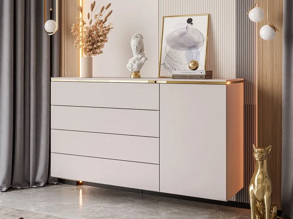 Комод Aurora — це ідеальне поєднання сучасного дизайну та функціональності. Мінімалістичний стиль із золотими акцентами та вишуканим відтінком кашміру надає інтер'єру елегантності та витонченості. Чотири місткі ящики забезпечують зручне зберігання, підтримуючи лад і організацію у вашому просторі. Ви можете вибрати підлогову або навісну модель, щоб ідеально вписати комоду у ваш інтер'єр. Колекція Aurora — це гармонія стилю, якості та практичності, яка додасть вашому дому затишку та вишуканості.