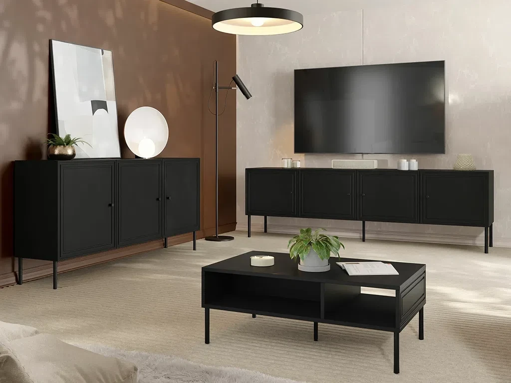 Набір меблів для вітальні Palazzo Bis від Польської фабрики Cama (Кама). Корпус виготовляється з ламінованого ДСП 16 мм, фасад із МДФ 16 мм. Випускається в кольорі: "чорний". Металеві ніжки та ручки, у кольорі: "чорний".